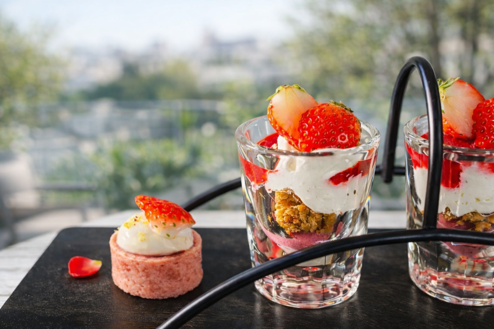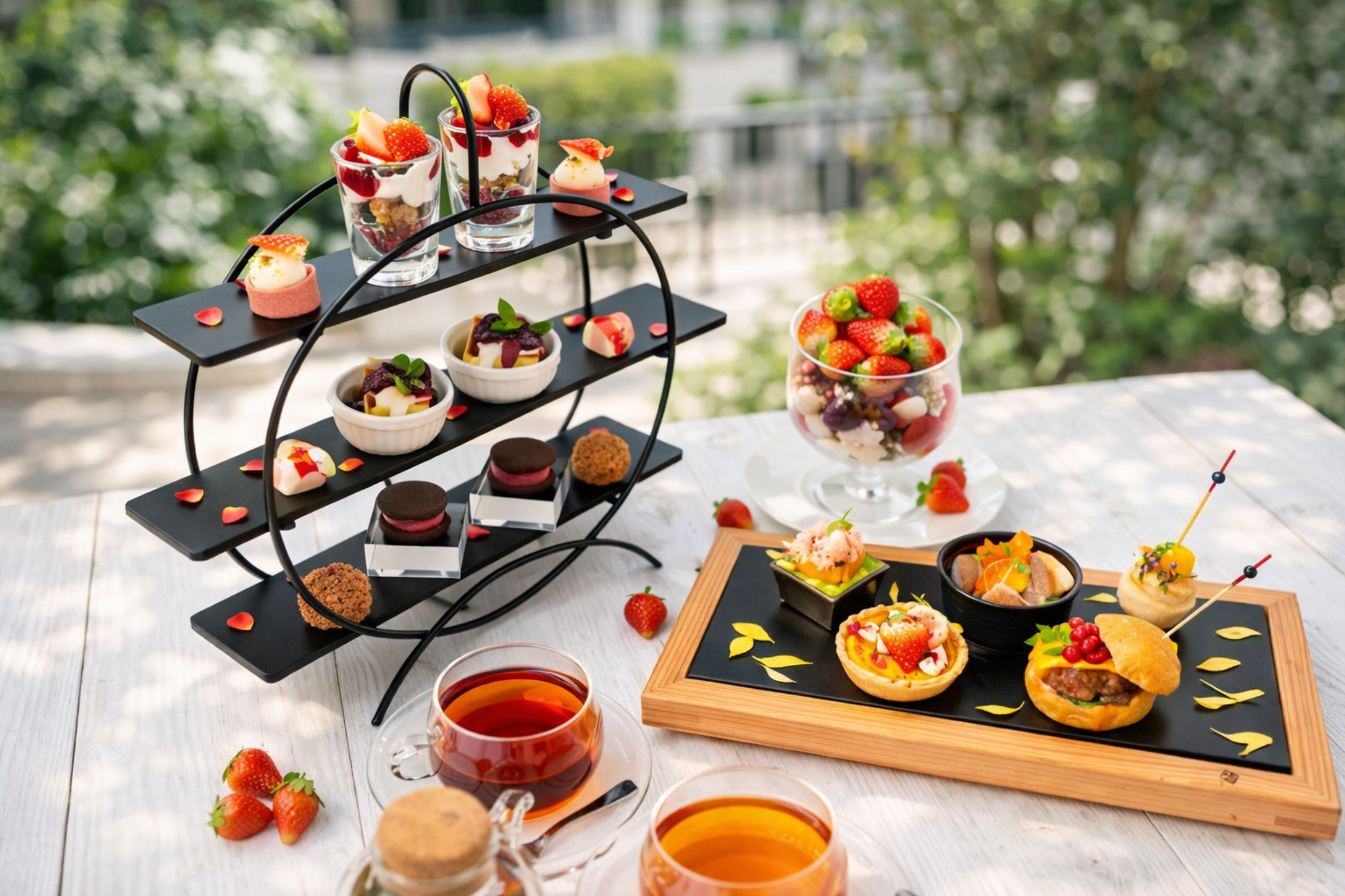 | 《Savory》 Strawberry-glazed pork belly with a hint of sakura Grilled chicken mini burger with redcurrant sauce Lightly grilled tuna with strawberry salsa Strawberry and cream cheese quiche Lobster caprese 《Sweets》 Strawberry mini parfait Strawberry tart Cheesecake with strawberry sauce Strawberry bonbon chocolat Raspberry sandwich cookies Raspberry and ruby chocolate crunch 《BLACK TERRACE’s Drink Selection 》 Mighty Leaf tea selection Iced tea Royal iced milk tea Coffee Americano Caffè latte Cappuccino Blooming tea (Globe amaranth) Blooming tea (Carnation) Soft Drink Coca-Cola Ginger ale Orange juice Apple juice Pineapple juice Oolong tea |